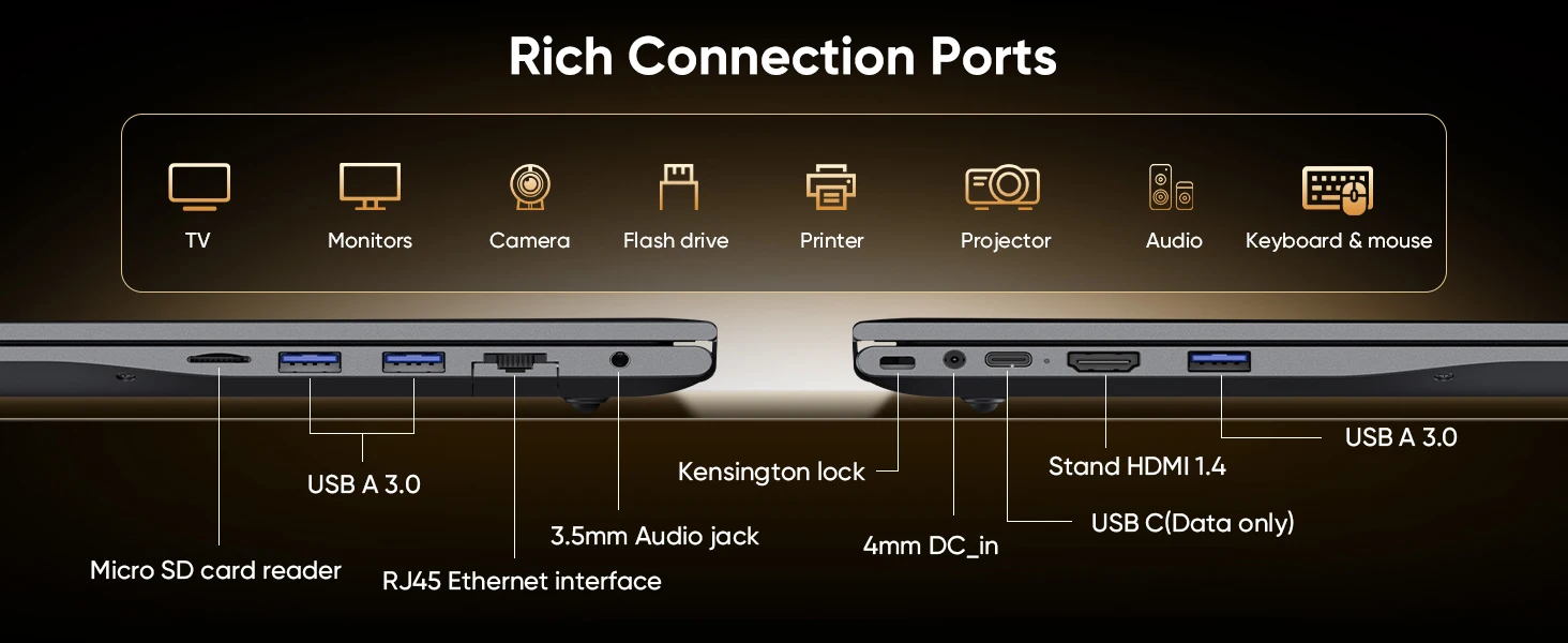 [Rich interfaces] 1x Micro SD Card, 3x USB-A 3.0, 1x RJ45, 1x Type-A HDMI, 1x Type-C (Data only) interface and other multi-functional interfaces enable you to easily connect external devices and peripherals for smooth data transmission and presentation