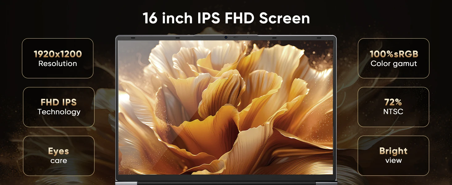 [16" FHD IPS Display] Win 11 Pro laptop comes with a 16-inch 1920 x 1200 high-resolution 16:10 screen ratio display with almost no borders around it, ultra-wide viewing experience, more visually beautiful, reducing eye viewing pressure, and providing you with a more comfortable viewing experience.