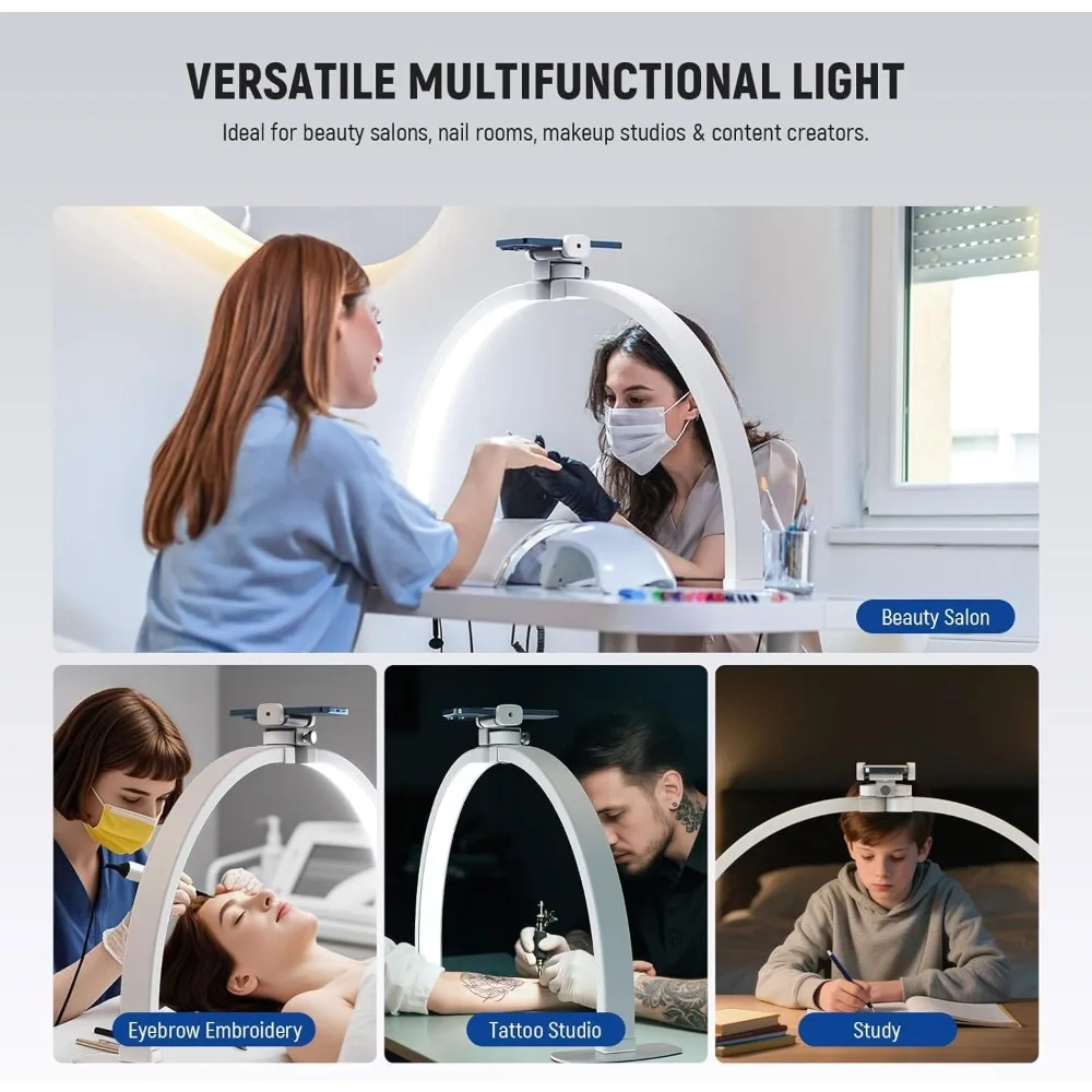 - 【Versatile LED Light】 A content creator essential tool for beauty salons, nail rooms, makeup artist studios, and alike, this multifunctional LED half ring halo lamp with phone holder mount is perfect key and fill lighting for a variety of tasks, including manicures, makeup application, eyelash extensions, tattoo creation, tutorial photos and recording, influencer and streamer must have gear to film professional nail tech video or live streaming, and overhead phone camera desk photography
