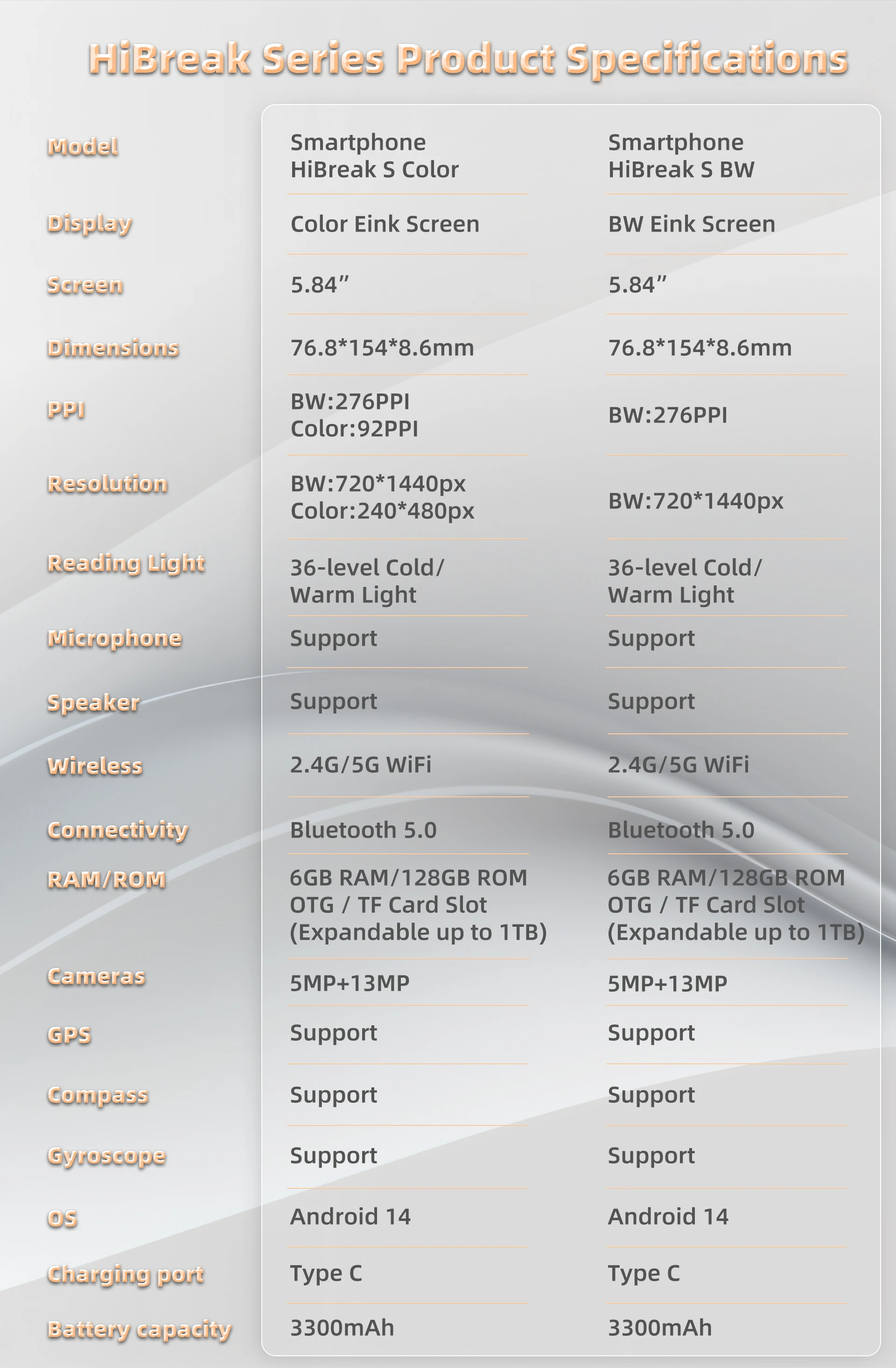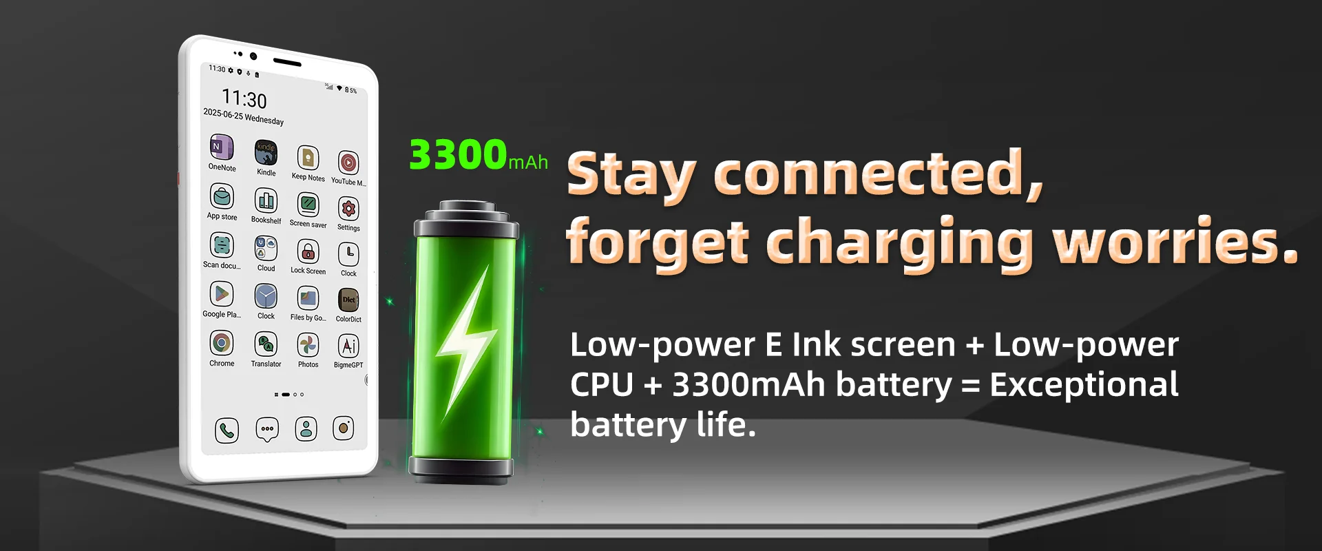 Experience extended usage without frequent recharges. The Bigme HiBreak S is equipped with a durable 3300mAh battery that, combined with its energy-efficient 5.84-inch E Ink screen, ensures long-lasting performance. This display is renowned for its ultra-low power consumption, as it only draws significant power when the content refreshes, allowing the device to maintain a charge for a remarkably long time. It designed for users who prioritize battery endurance and comfortable, paper-like reading experiences over intensive multimedia use.