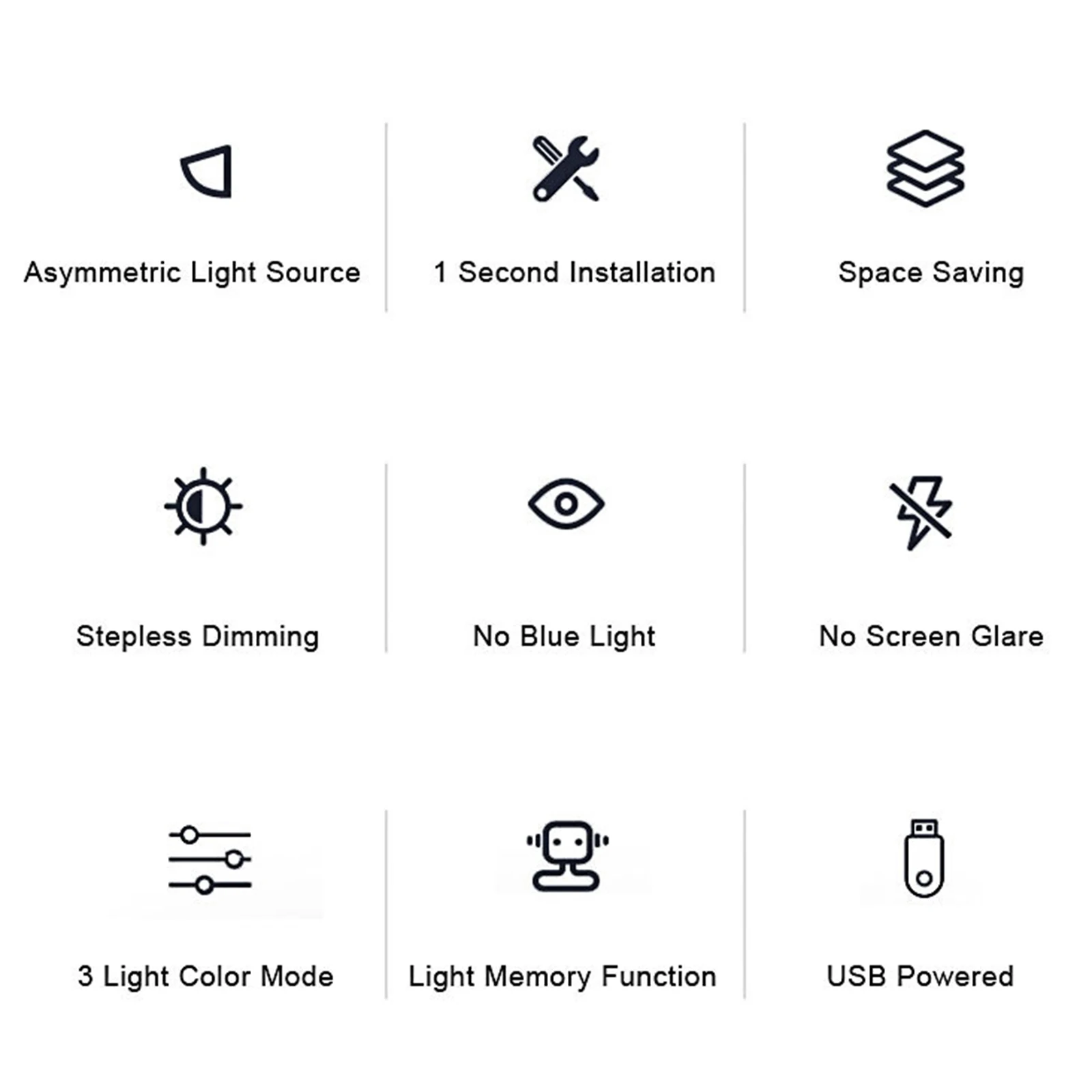 Features: 1.No Base Design, Save Desktop Space: The monitor light bar uses a hanging design that eliminates the need for a base, freeing up valuable desk space. Effortlessly attaches to your screen and provides a stable hold while keeping your desktop organized. 2.Asymmetric Light Source for Eye Comfort: This computer monitor lamp features directional lighting to avoid screen reflections and glare, reducing eye strain and creating a healthier visual environment for prolonged use. 3.Multiple Dimming Modes for Versatility: Adjust the desk lamp to suit any scenario with three color temperature options from cool to warm and step-less brightness control, accommodating different needs for work, study, or relaxation. 4.Convenient Power Supply Options: Equipped with a Type-C port, the screen light bar can be powered via computer, adapter, or power bank, offering hassle-free and flexible powering solutions for increased convenience. 5.60-Minute Auto-Off Timer for Eye Health: The screenbar includes an automatic shut-off function set at 60 minutes to remind you to rest your eyes, protecting your vision and promoting healthy usage habits. Specification: Origin: Mainland China Product Size: 19.69 x 1.3 x 0.59 inches Product Material: ABS+PC Power Supply: Type-C interface Light Source: LED (2835*78*0.5W/LED) Rated Power: 5W Rated Voltage: 5V/1A Luminous Flux: 201LM Color Temperature: 3000/4000/6500K Timer: 60 minutes Adjustment: Touchscreen stepless dimming Note: Suitable for displays ≤550mm in length. This product is suitable for desktop computer displays ≤22mm thick and ≤10° tilt. Manual adjustment is required.