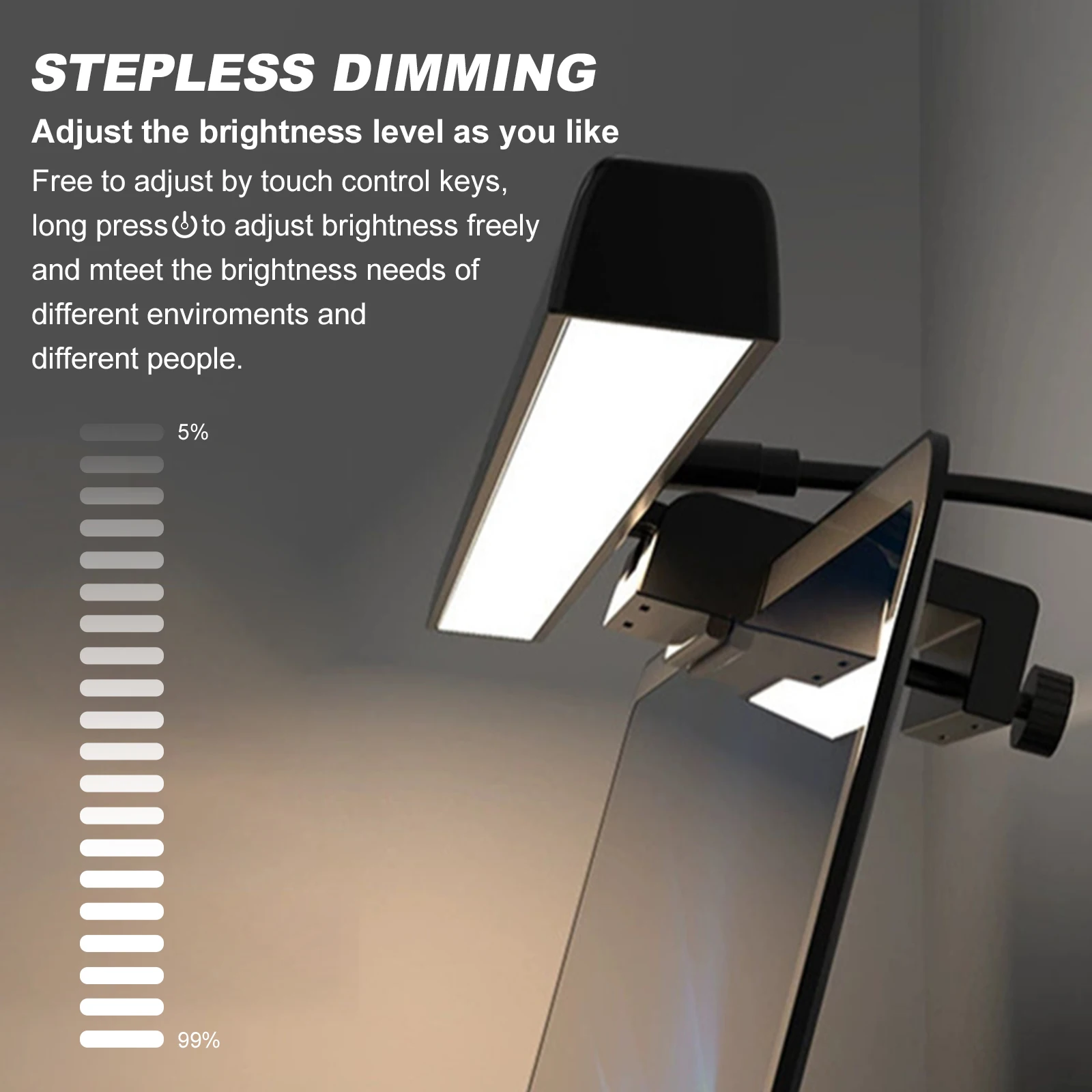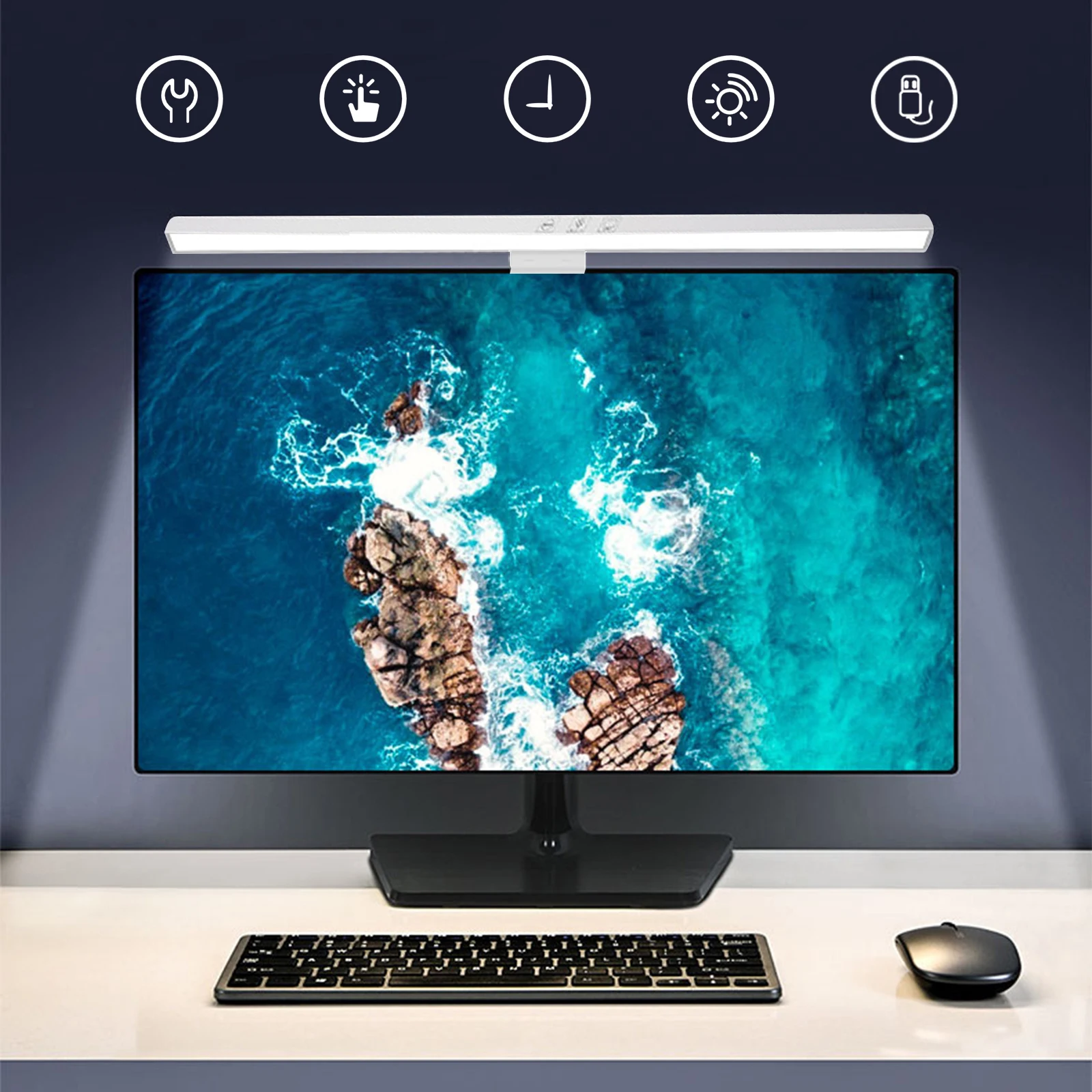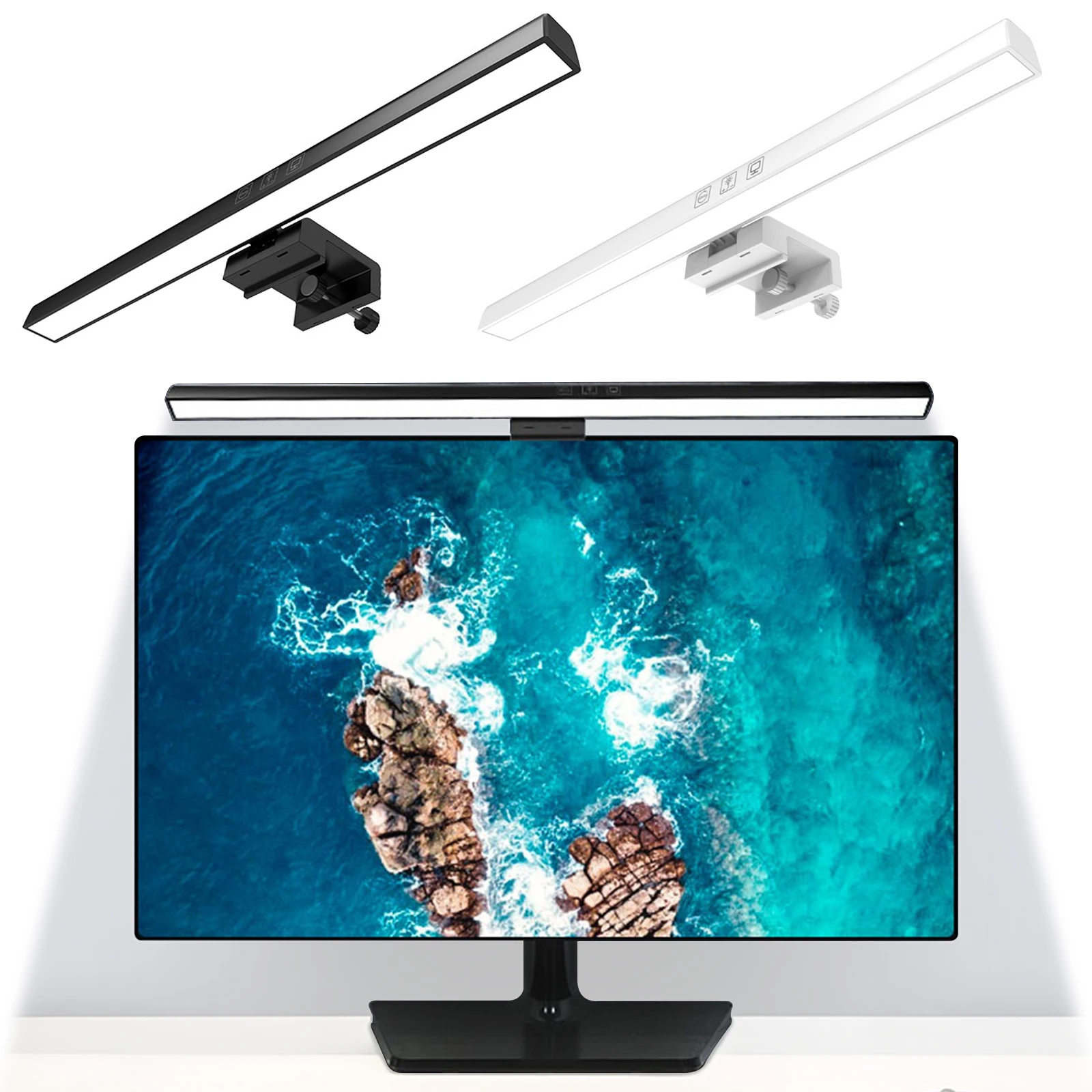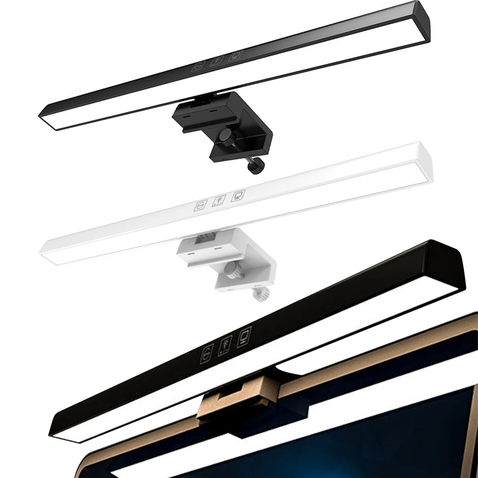 Note: LED Monitor Light Bar Dimmable Computer Monitor Lamp USB Powered Hanging Table Lamp for Desk/Office/Home/Game Features: 1.No Base Design, Save Desktop Space: The monitor light bar uses a hanging design that eliminates the need for a base, freeing up valuable desk space. Effortlessly attaches to your screen and provides a stable hold while keeping your desktop organized. 2.Asymmetric Light Source for Eye Comfort: This computer monitor lamp features directional lighting to avoid screen reflections and glare, reducing eye strain and creating a healthier visual environment for prolonged use. 3.Multiple Dimming Modes for Versatility: Adjust the desk lamp to suit any scenario with three color temperature options from cool to warm and step-less brightness control, accommodating different needs for work, study, or relaxation. 4.Convenient Power Supply Options: Equipped with a Type-C port, the screen light bar can be powered via computer, adapter, or power bank, offering hassle-free and flexible powering solutions for increased convenience. 5.60-Minute Auto-Off Timer for Eye Health: The screenbar includes an automatic shut-off function set at 60 minutes to remind you to rest your eyes, protecting your vision and promoting healthy usage habits. Specification: Origin: Mainland China Product Size: 19.69 x 1.3 x 0.59 inches Product Material: ABS+PC Power Supply: Type-C interface Light Source: LED (2835*78*0.5W/LED) Rated Power: 5W Rated Voltage: 5V/1A Luminous Flux: 201LM Color Temperature: 3000/4000/6500K Timer: 60 minutes Adjustment: Touchscreen stepless dimming Note: Suitable for displays ≤550mm in length. This product is suitable for desktop computer displays ≤22mm thick and ≤10° tilt. Manual adjustment is required.