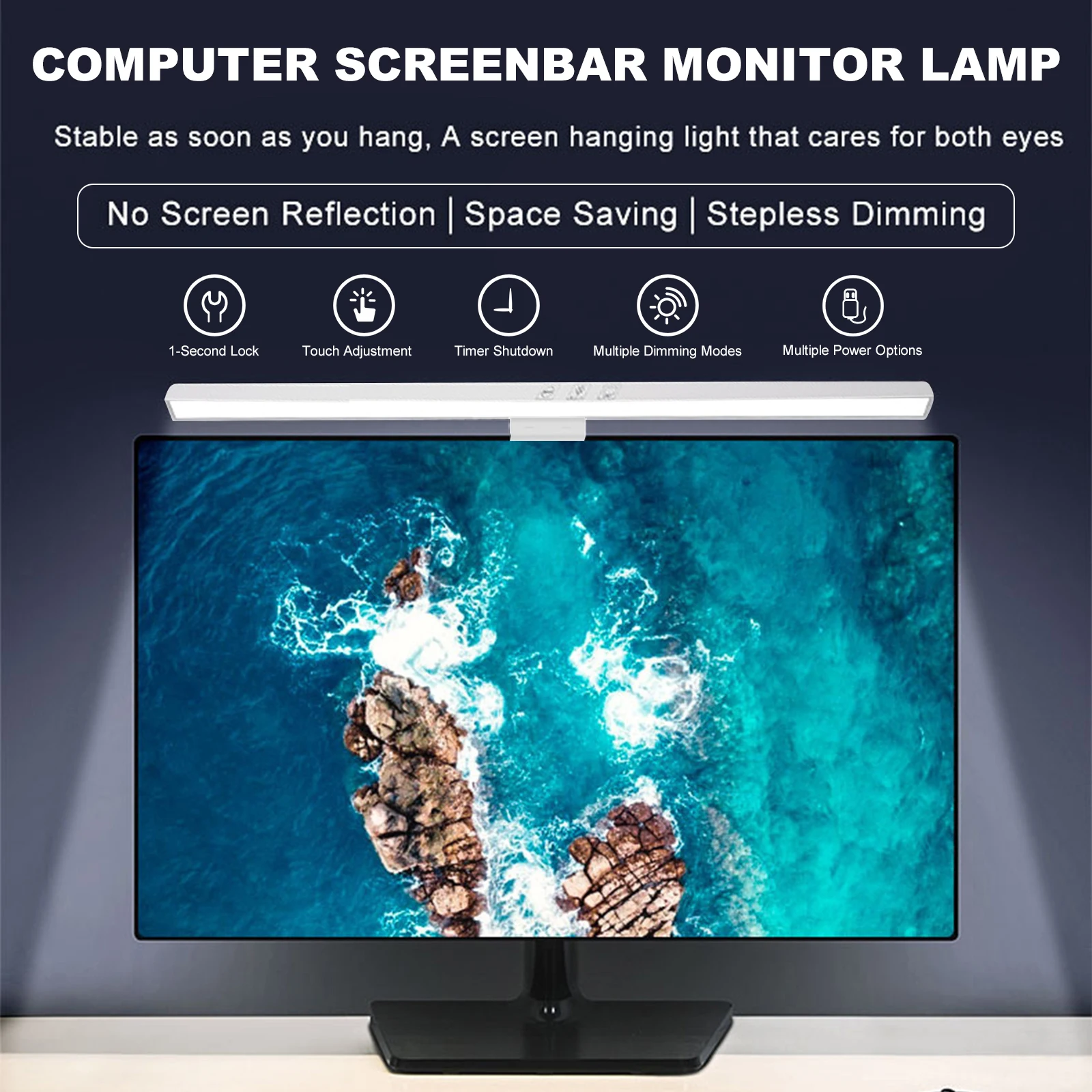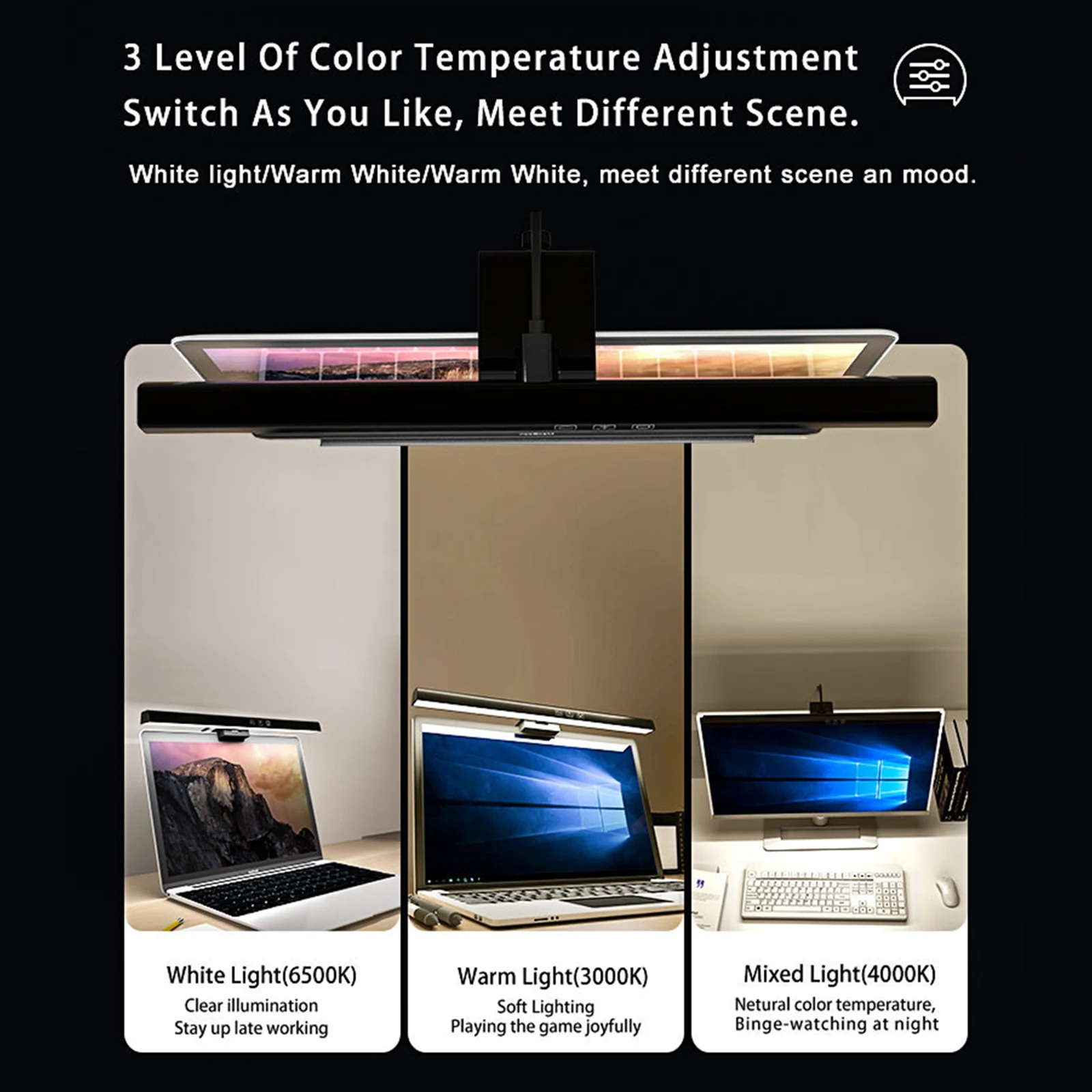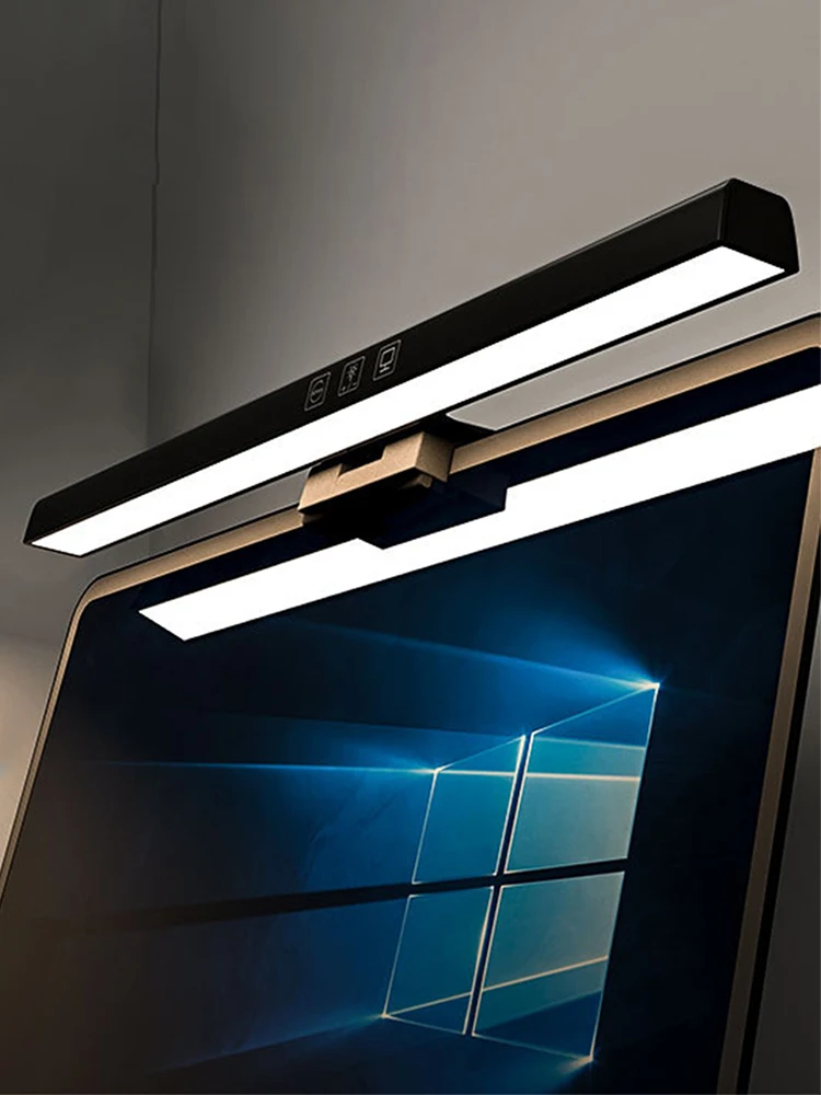 Note: LED Monitor Light Bar Dimmable Computer Monitor Lamp USB Powered Hanging Table Lamp for Desk/Office/Home/Game Features: 1.No Base Design, Save Desktop Space: The monitor light bar uses a hanging design that eliminates the need for a base, freeing up valuable desk space. Effortlessly attaches to your screen and provides a stable hold while keeping your desktop organized. 2.Asymmetric Light Source for Eye Comfort: This computer monitor lamp features directional lighting to avoid screen reflections and glare, reducing eye strain and creating a healthier visual environment for prolonged use. 3.Multiple Dimming Modes for Versatility: Adjust the desk lamp to suit any scenario with three color temperature options from cool to warm and step-less brightness control, accommodating different needs for work, study, or relaxation. 4.Convenient Power Supply Options: Equipped with a Type-C port, the screen light bar can be powered via computer, adapter, or power bank, offering hassle-free and flexible powering solutions for increased convenience. 5.60-Minute Auto-Off Timer for Eye Health: The screenbar includes an automatic shut-off function set at 60 minutes to remind you to rest your eyes, protecting your vision and promoting healthy usage habits. Specification: Origin: Mainland China Product Size: 19.69 x 1.3 x 0.59 inches Product Material: ABS+PC Power Supply: Type-C interface Light Source: LED (2835*78*0.5W/LED) Rated Power: 5W Rated Voltage: 5V/1A Luminous Flux: 201LM Color Temperature: 3000/4000/6500K Timer: 60 minutes Adjustment: Touchscreen stepless dimming Note: Suitable for displays ≤550mm in length. This product is suitable for desktop computer displays ≤22mm thick and ≤10° tilt. Manual adjustment is required.