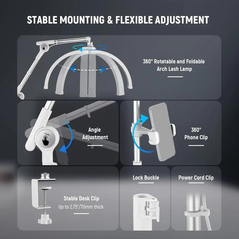 【Upgraded with a oldable Desk Stand】 The proional hal moon lash light or esthetician includes an adjustable C clamp desk stand with a 3 segment aulating arm that extends up to 35"/90cm in height, oering lighting lexibility. It lets you position the light higher without blocking your view, setting the HM03-D apart rom other arc nail lamps that sit directly on the tabletop without height adjusent. The clamp mount can be attached to lat up to 2.75" (70mm) thick