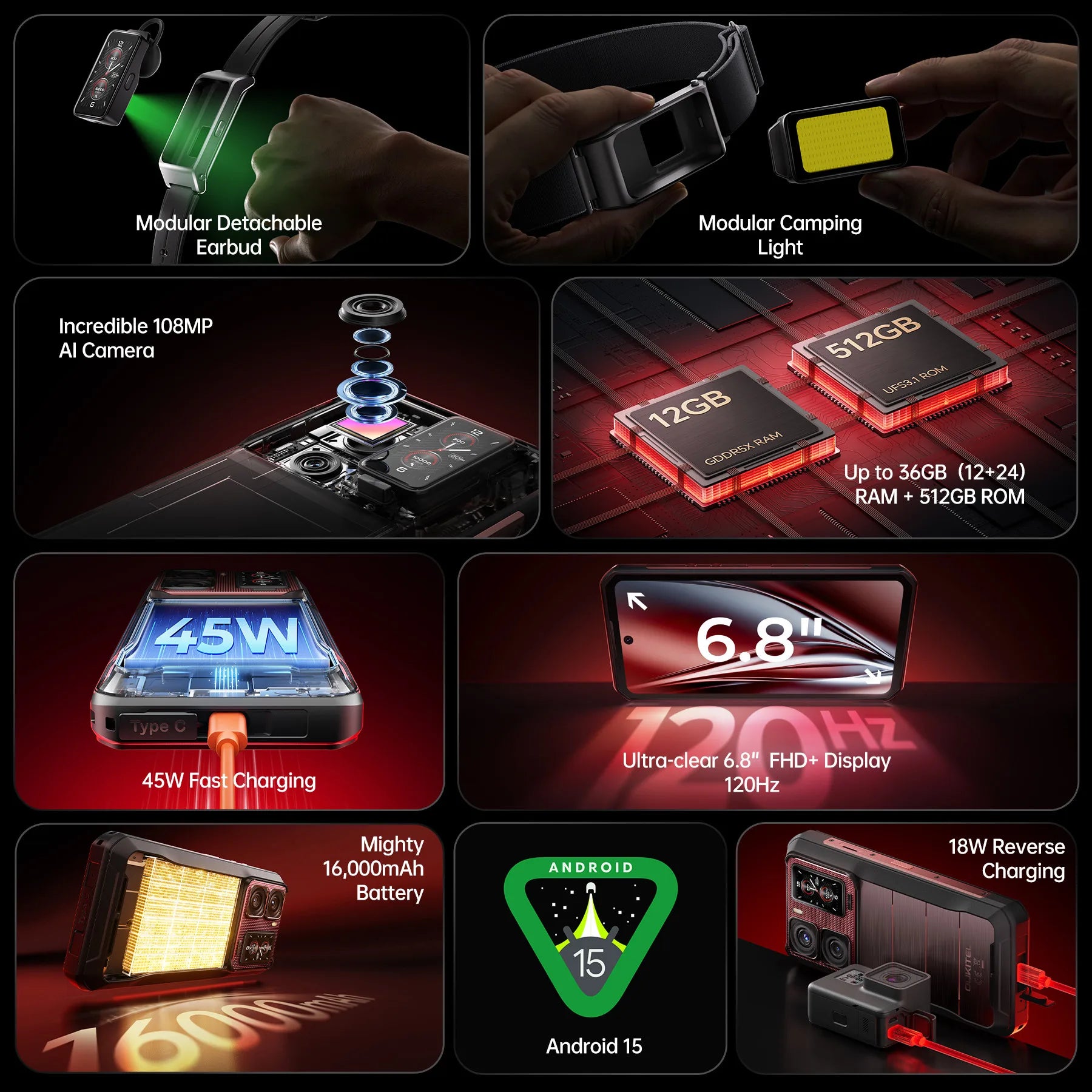 Oukitel WP300 Rugged Phone 16000mAh 36GB(12+24)GB+512GB Modular detachable Earbud/camping Light 6.78" FHD 120Hz 108MP Cell pho
