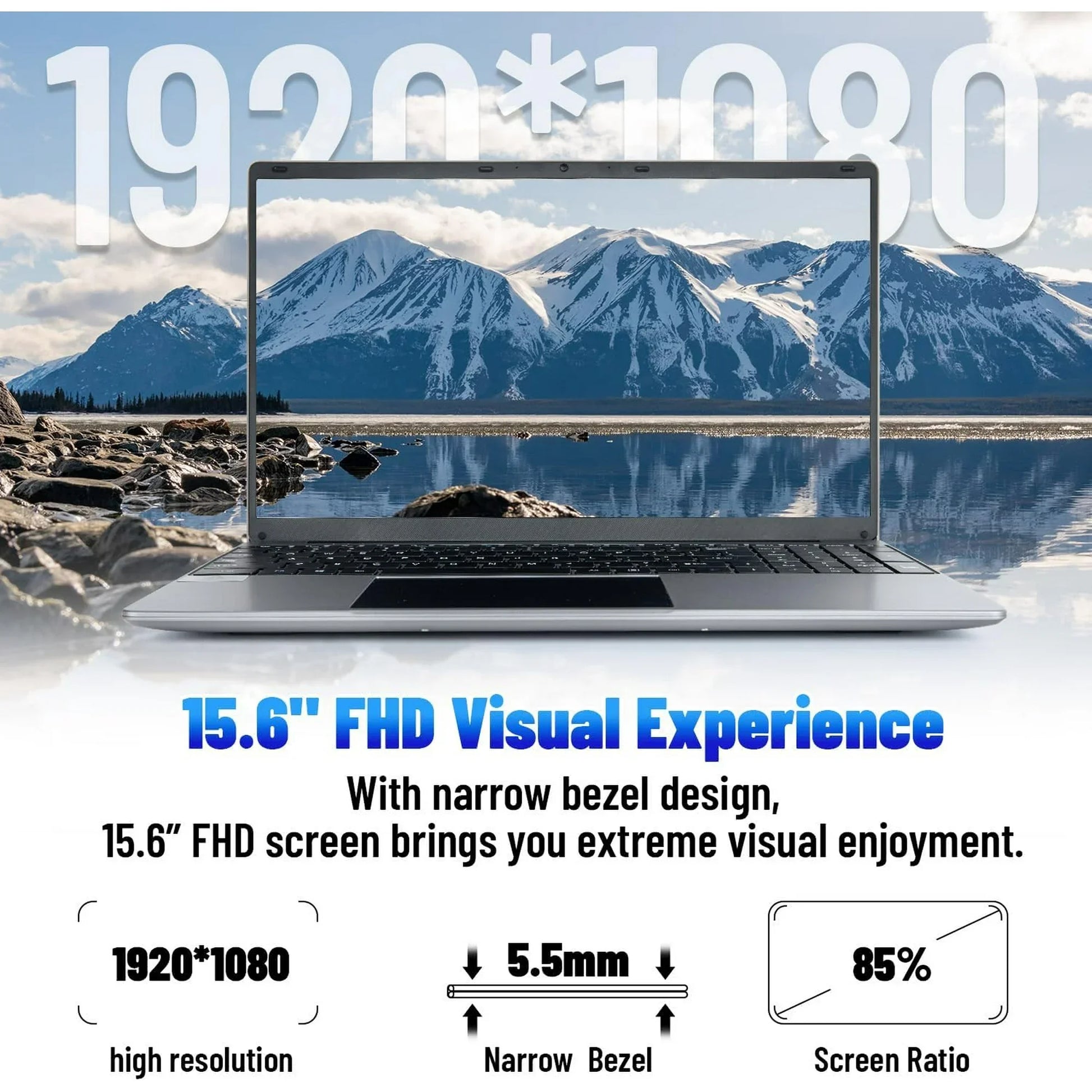 15.6-inch large IPS screen with 1920*1080 pixels, 5.5mm narrow bezel, 16:9 ratio, and a screen-to-body ratio of up to 85%. URAO notebook laptop provides a clear and wide viewing screen, better visual perception and healthier eyes.